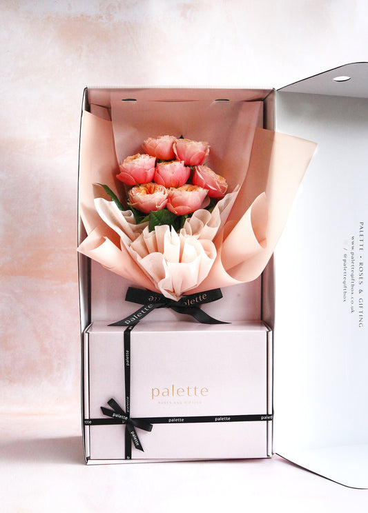 Our signature Palette box includes 7, 9 or 12 stems of luxury roses wrapped beautifully and sent alongside a gift box full of treats and a handwritten notecard