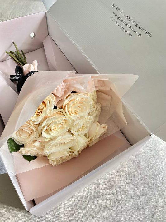 Send 9 or 12 stems of luxury roses on their own, wrapped beautifully in our large Palette box and sent with a handwritten notecard